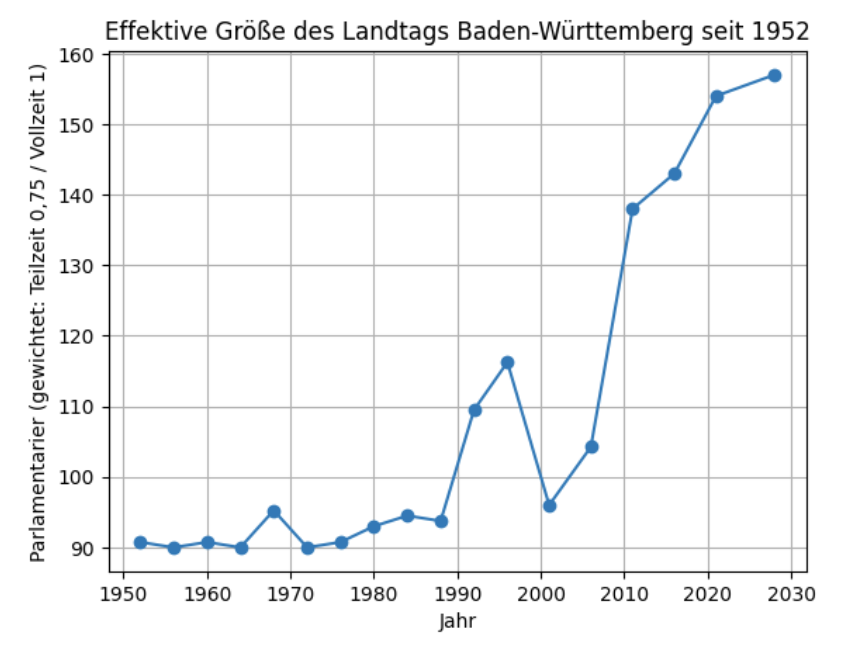 | 2011–2016 | 15. Landtag BW | 138 | Übergang zur Vollzeit | Grüne + SPD | Winfried Kretschmann (Grüne) Wikipedia |